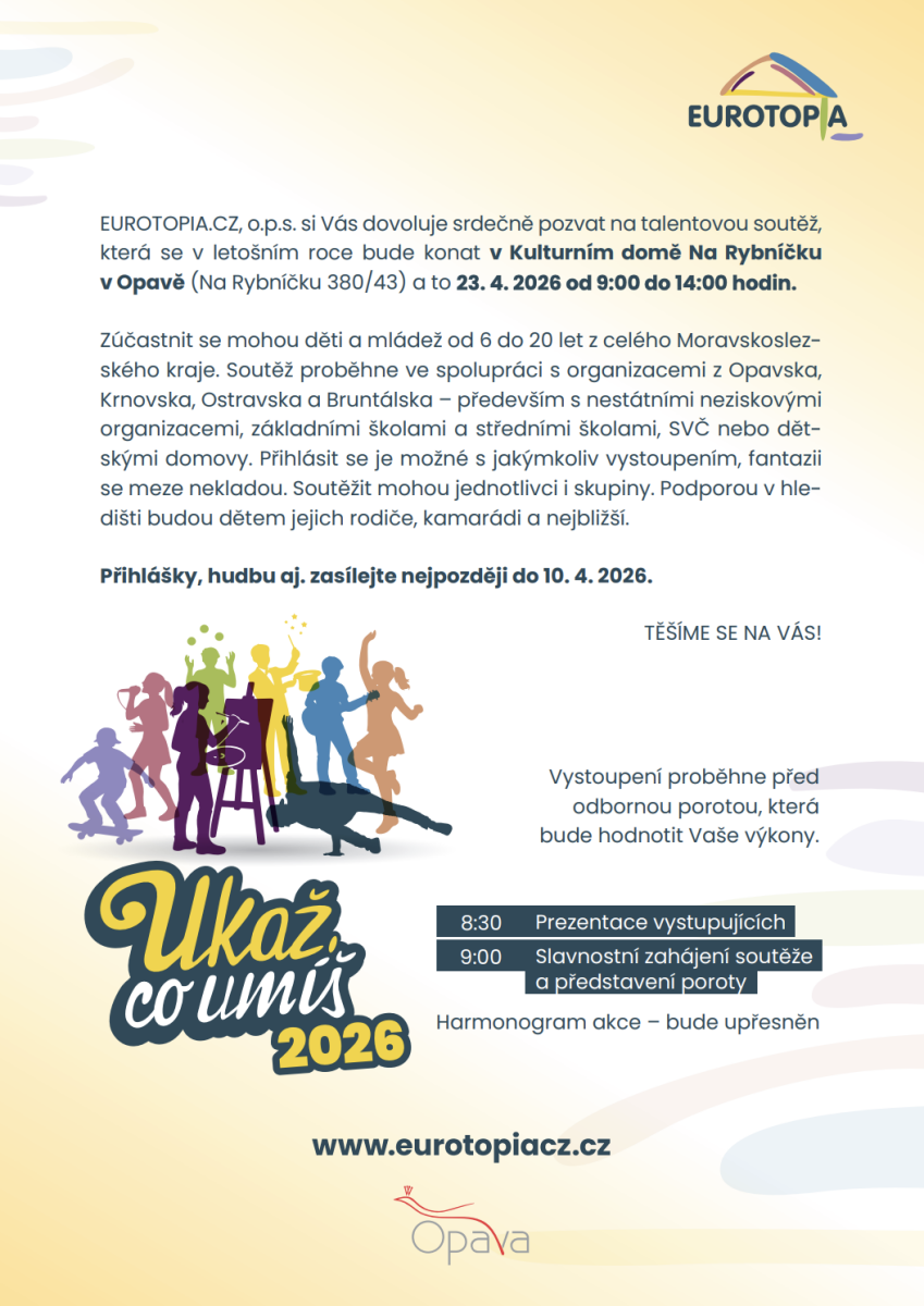 Srdečně zveme mladé talenty na 9. ročník oblíbené soutěže „UKAŽ, CO UMÍŠ“, která je určena dětem a mládeži zejména z Moravskoslezského kraje. Veřejná vystoupení před porotou proběhnou ve čtvrtek 23. dubna 2026 již tradičně v prostorách Kulturního domu Na Rybníčku v Opavě.