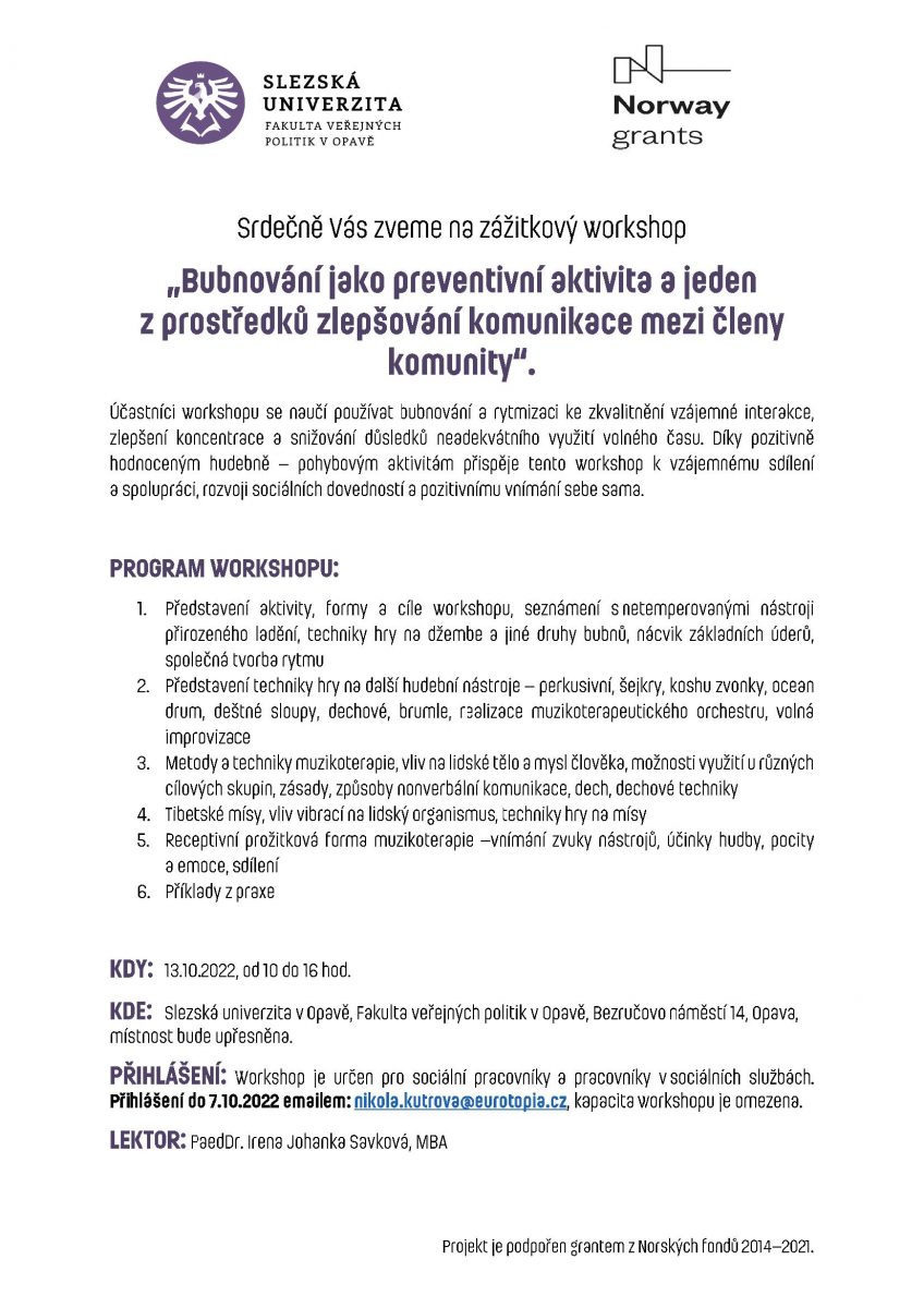 Zážitkový workshop „Bubnování jako preventivní aktivita a jeden z prostředků zlepšování komunikace mezi členy komunity“