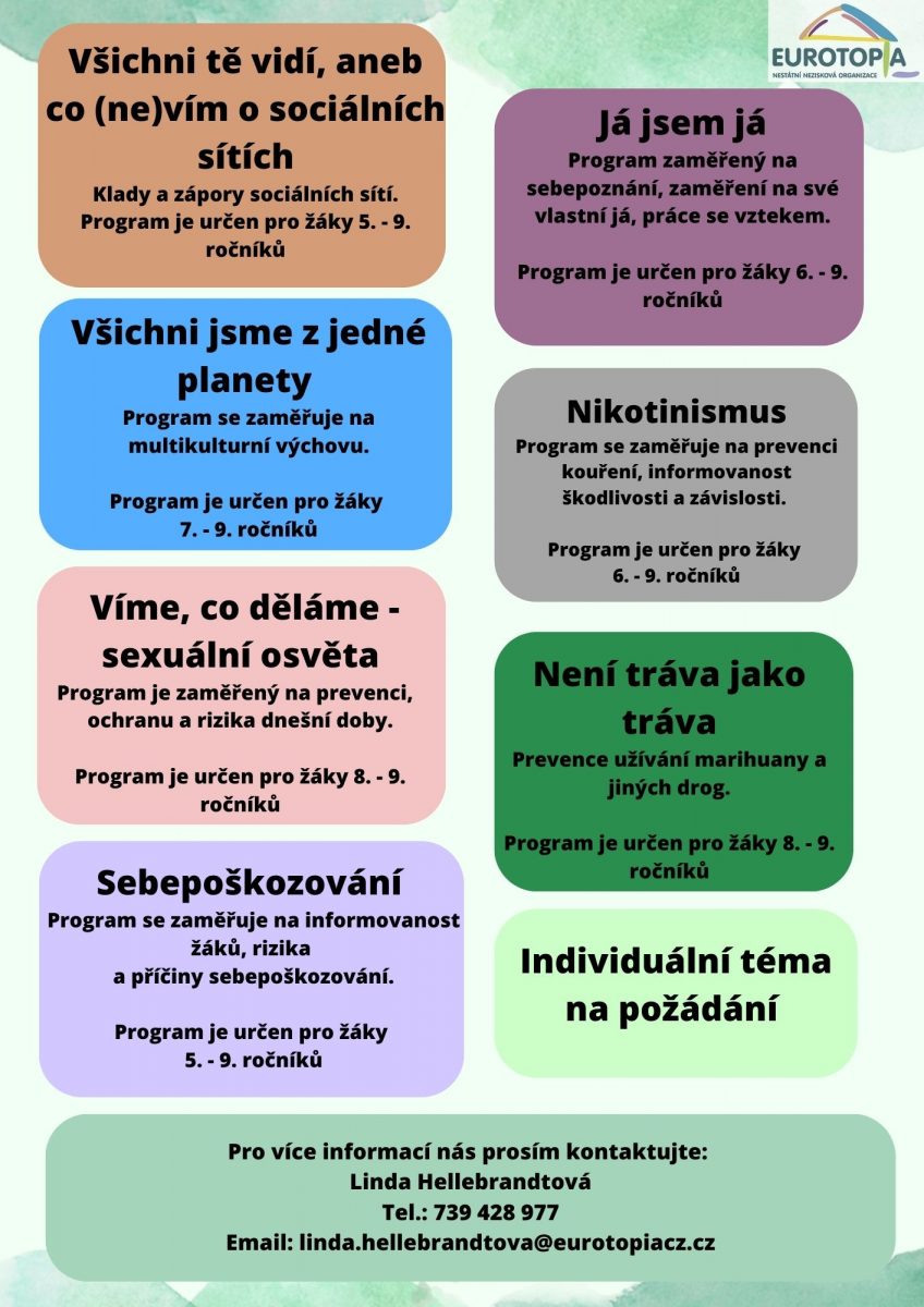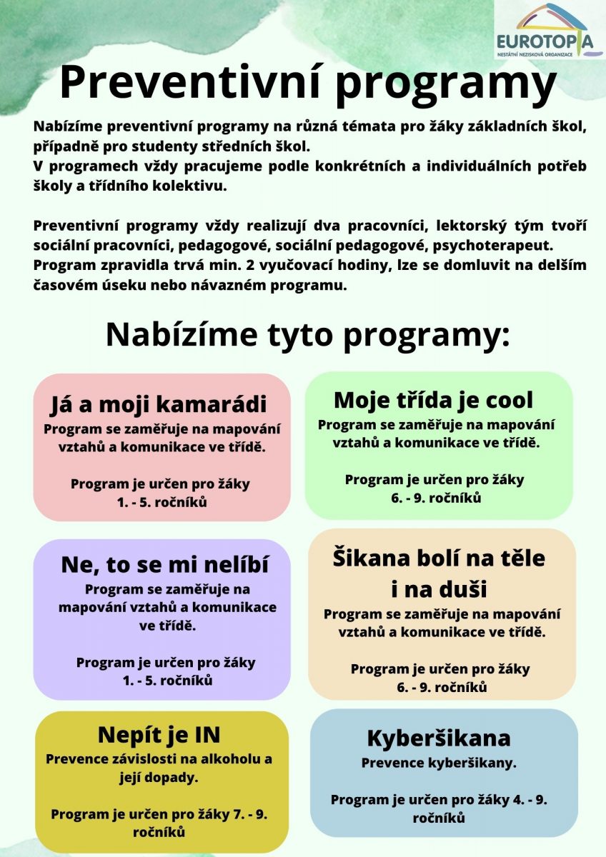 Prevence, ať už jakákoliv, je ve světě jedno z nejdůležitějších témat. Proto vnímáme jako zásadní se touto oblastí zabývat a nabízet podporu na úrovni škol, pedagogů a žáků. Při práci s třídními kolektivy pracujeme vždy podle konkrétních a individuálních potřeb školy a třídního kolektivu. Pokud je to potřeba, poskytujeme také programy návazné.