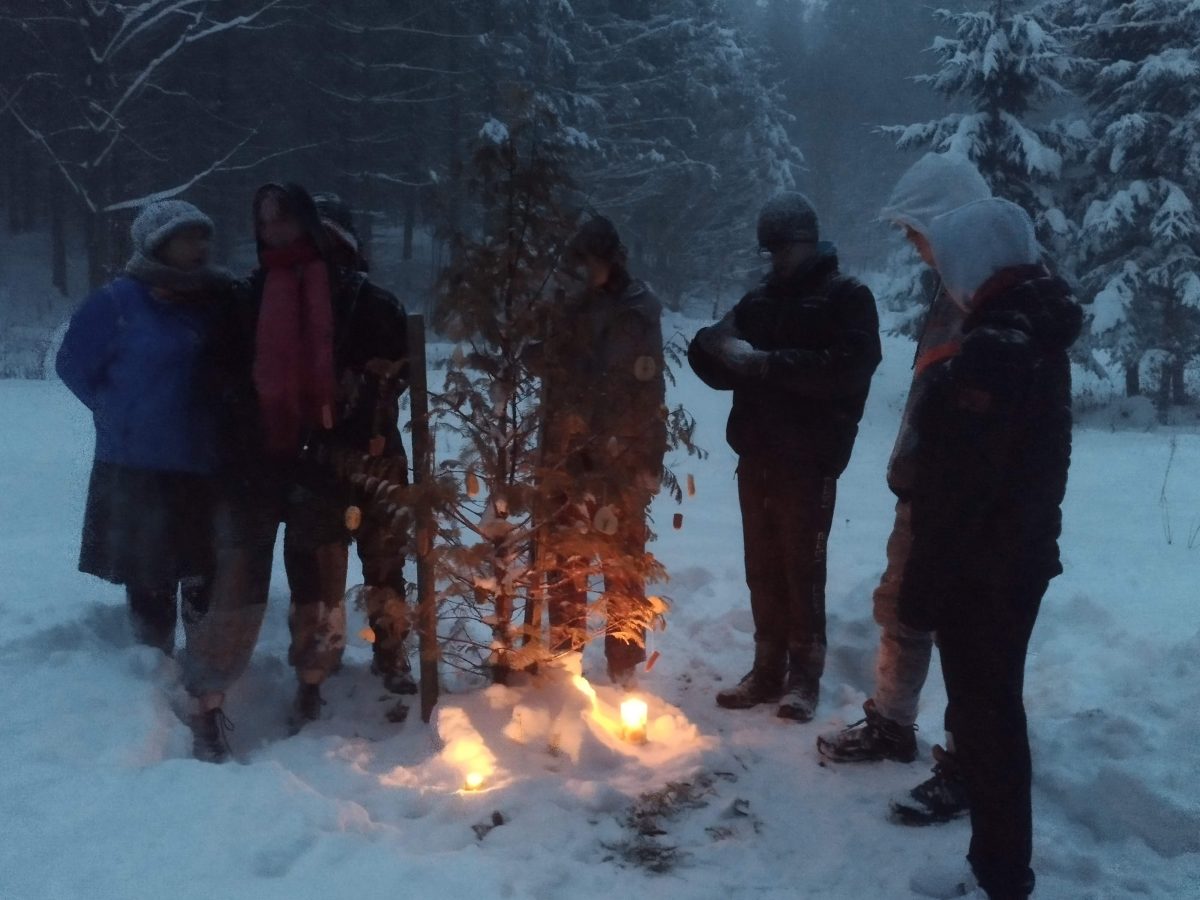 A v sobotu jsme si udělali malé Ladovské vánoce – nastrojili jsme venku stromeček – a to nejen pro nás, ale i dobrotami pro zvířátka, aby po nás něco hezkého zůstalo. Nastrojený stromeček venku pod něžně padajícími sněhovými vločkami byl moc hezký a i zazpívaná koleda měla své kouzlo. No a pak už jsme si v teple u kamen zazpívali koledy, poseděli u štědrovečerní večeře a také si rozdali vzájemně malé dárky. Vyzkoušeli jsme taky různé vánoční tradice, co a jak u koho probíhá, co děláme a co známe.