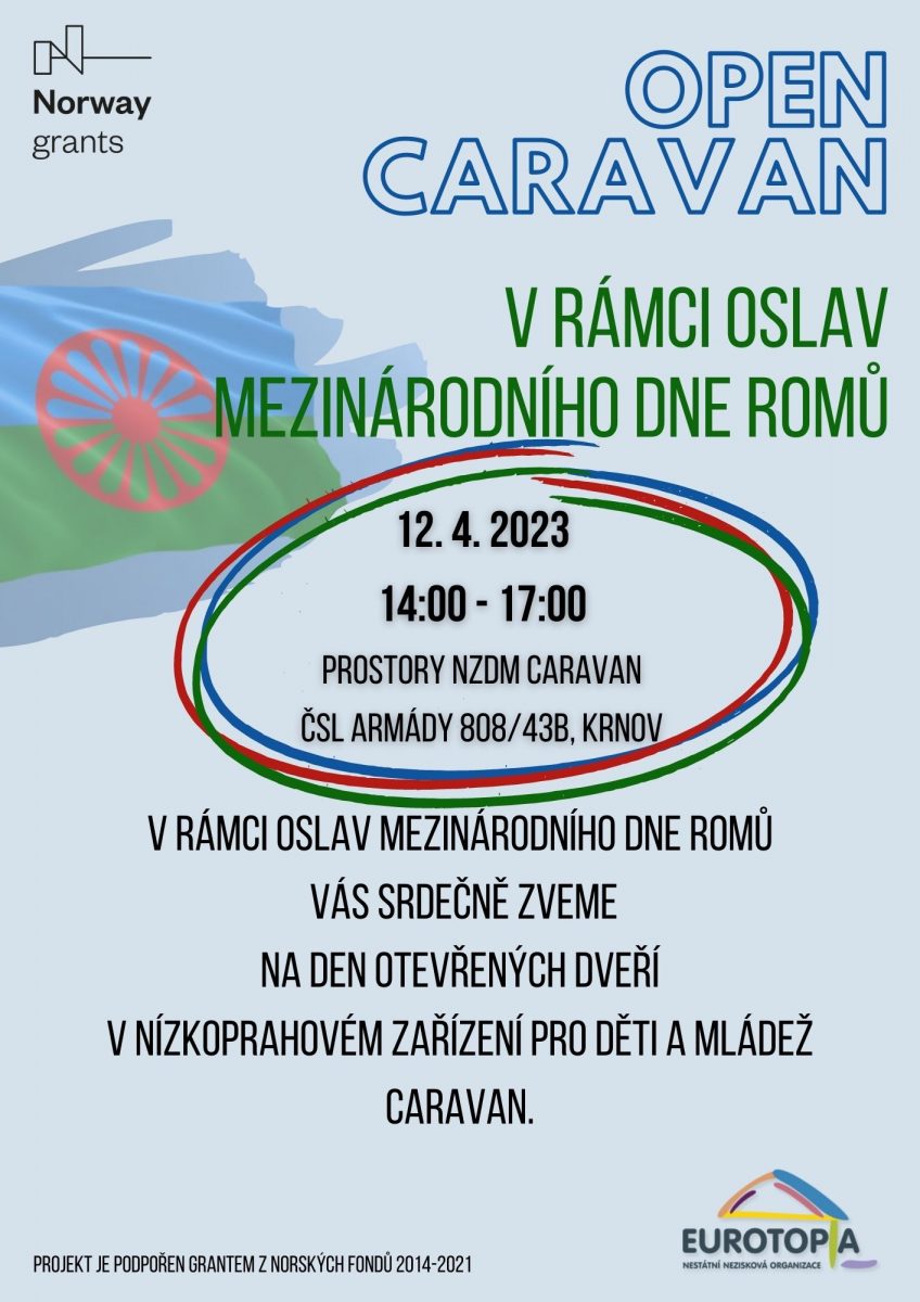 srdečně Vás zveme na den otevřených dveří v Caravanu, který se koná ve středu 12. dubna 2023. Tuto akci pořádáme také k příležitosti oslav Mezinárodního dne Romů a připravili jsme pro Vás skvělý doprovodný program.