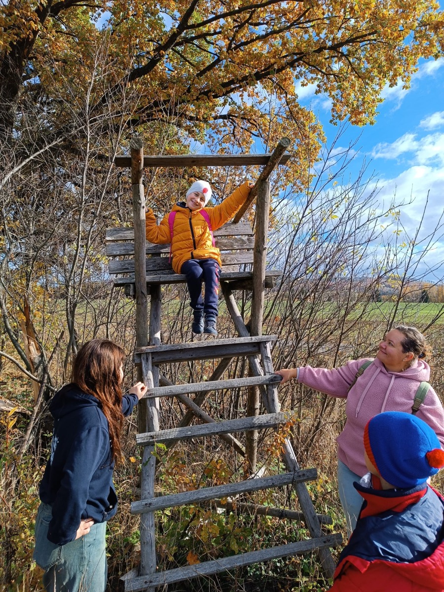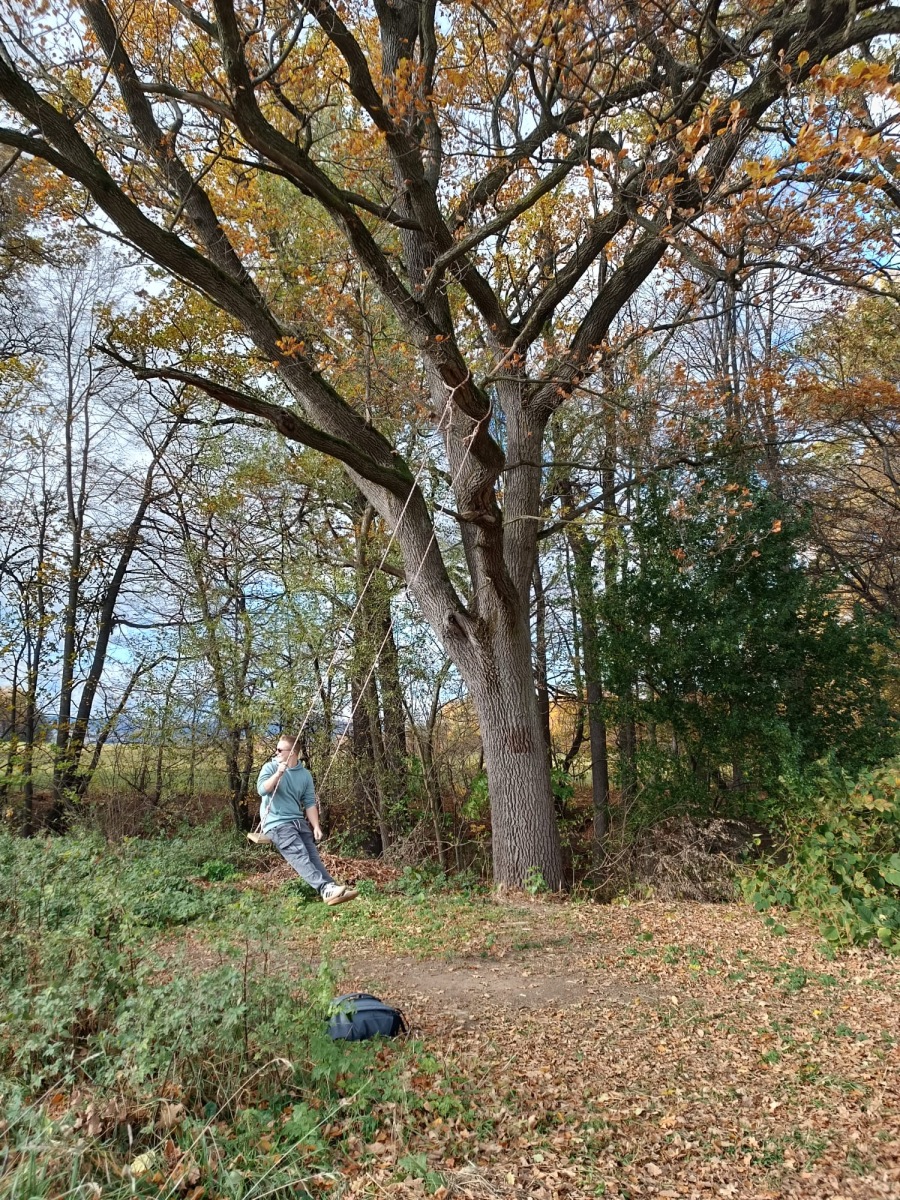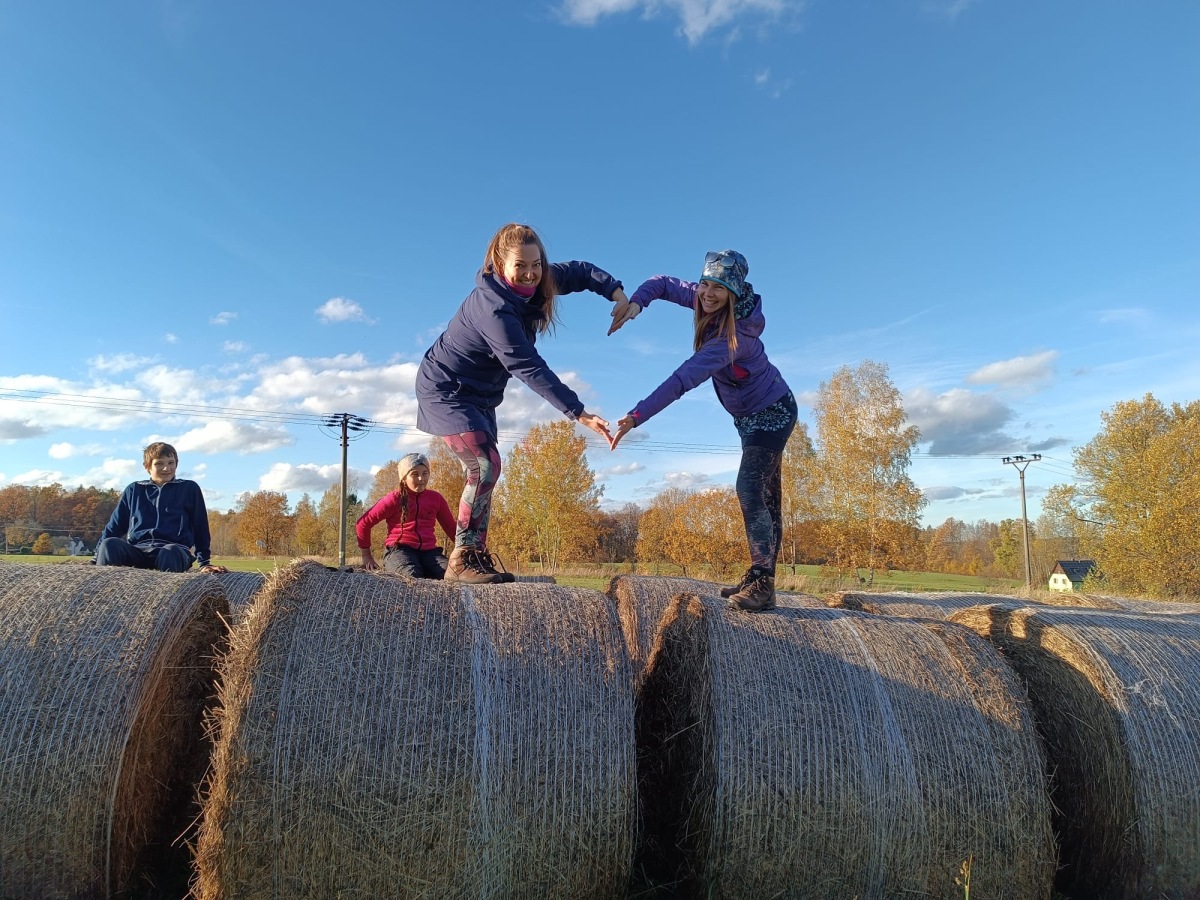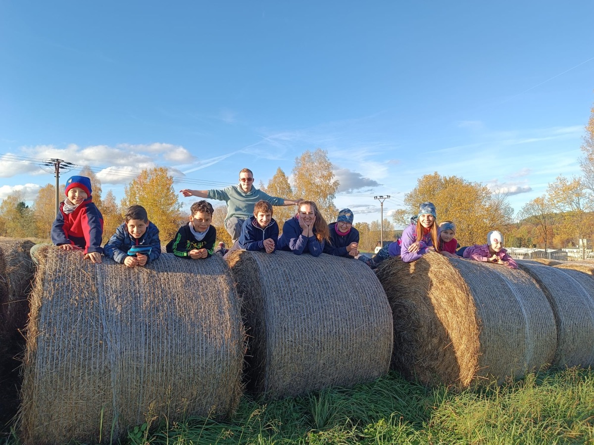 V poledne se výletníci zastavili v maličké hospůdce po cestě, kde se posilnili pizzou, pohráli si na dětském hřišti a prohlédli si pár domácích zvířat v ohradě. Po doplnění energie je čekal ještě velký kus cesty do cíle, místy se už ozývaly protesty, ale ty nebyly nic platné, protože jedinou variantou bylo trasu dokončit a dostat se do civilizace k autobusu. Naštěstí dětem cestu zpříjemňovaly časté pauzy, během kterých se jim díky správným odpovědím na otázky postupně odkrývala tajenka. Ale aby výlet nebyl jen o chození a přemýšlení, byl prostor i pro podzimní radovánky jako házení listí nebo chození po balících slámy a pózování na společné fotografie.