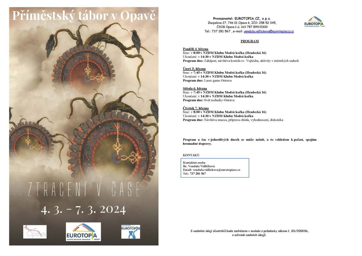 Zveme děti od 6 do 15 let z Opavy a okolí na jarní příměstský tábor, který bude probíhat od pondělí 4. 3. do čtvrtku 7. 3. 2024 v Opavě a blízkém okolí. Na programu je plno zajímavých akcí a zábavy.