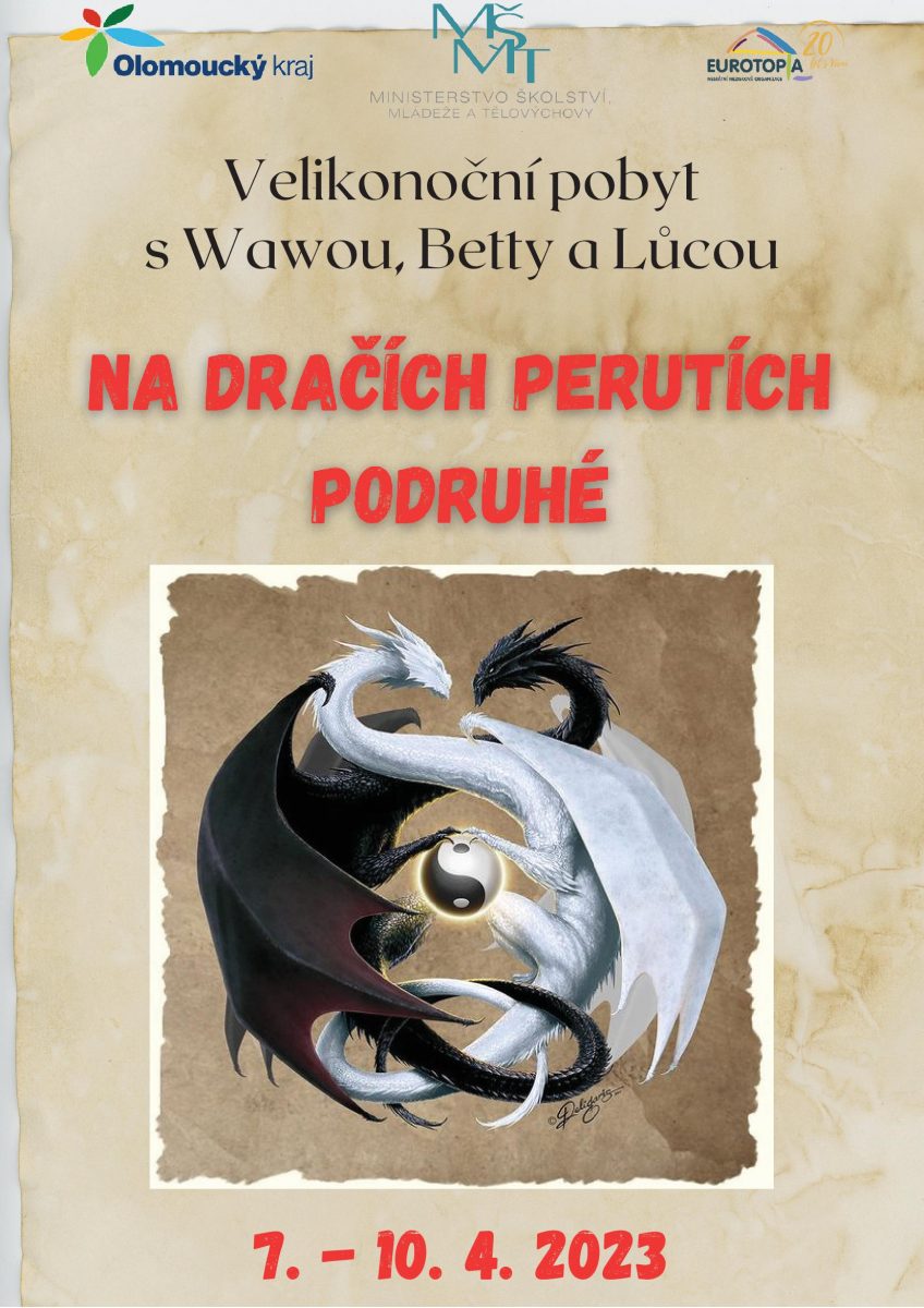 Zveme děti a mládež od 15 let na velikonoční pobyt „Na dračích perutích podruhé“, který se opět uskuteční v romantické chatě uprostřed přírody poblíž obce Vápenná u Jeseníku v termínu od 7. do 10. 4. 2023. Pro přihlášení vyplňte přihlášku a informovaný souhlas níže a zašlete je na e-mail: barbora.brhelova@eurotopia.cz do 31. 3. 2023. Bližší informace k pobytu naleznete ZDE.