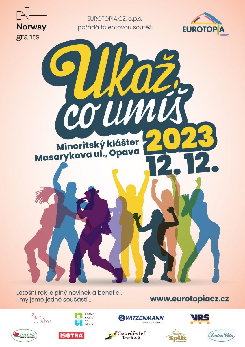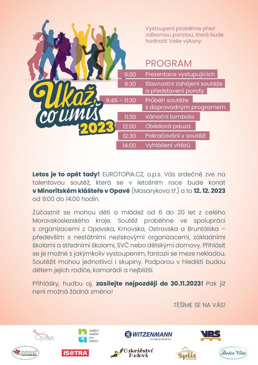 EUROTOPIA.CZ Vás srdečně zve na talentovou soutěž „Ukaž, co umíš“, která proběhne v Opavě v Minoritském klášteře na ulici Masarykova tř. 342/39 v úterý 12. 12. 2023 od 9:00 hodin. Přijďte podpořit talentované děti a mladé umělce z Opavska, Krnovska, Ostravska a Bruntálska, kteří ve spolupráci s nestátními neziskovými organizacemi, základními školami, SVČ nebo dětskými domovy nacvičili svá vystoupení a představí je na naší akci veřejnosti a také odborné porotě.
