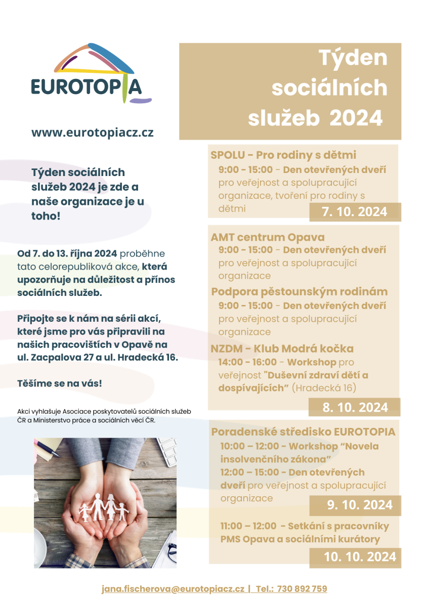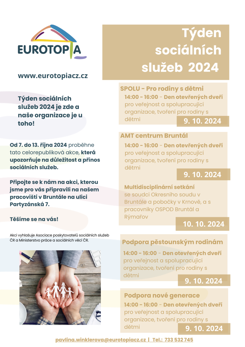 Naše organizace EUROTOPIA.CZ se i letos připojuje k celorepublikové akci Týden sociálních služeb 2024, která proběhne od 7. do 13. října 2024. Tuto akci, která vždy probíhá v prvním říjnovém týdnu, každoročně vyhlašuje Česká asociace poskytovatelů sociálních služeb, Partnerem akce je také Ministerstvo práce a sociálních věcí ČR. Jejím cílem je upozornit na význam sociálních služeb v naší společnosti a přiblížit veřejnosti, jaký dopad mají na život rodin, dětí i dospělých v obtížných situacích.